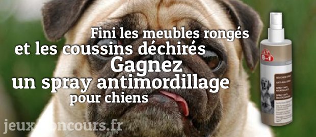 Le prix se composera du lot suivant : 1 spray antimordillage pour chiens d’une valeur marchande de 6.90 €.